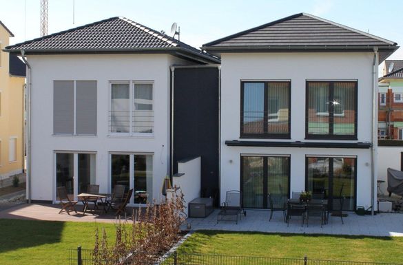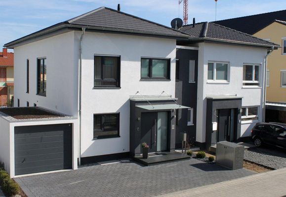 Durch die Gestaltung eines separaten Walmdachs je Doppelhaushälfte und der vertikalen Trennung unter dem dazwischenliegenden Flachdachbereich, konnte eine sehr eigenständige Erscheinung der beiden Doppelhaushälften erreicht werden.